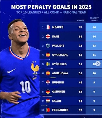 德国转会市场统计了效力于欧洲前十联赛,在2025年各项赛事(包含国家队比赛)打进点球最多的球员:
